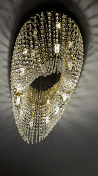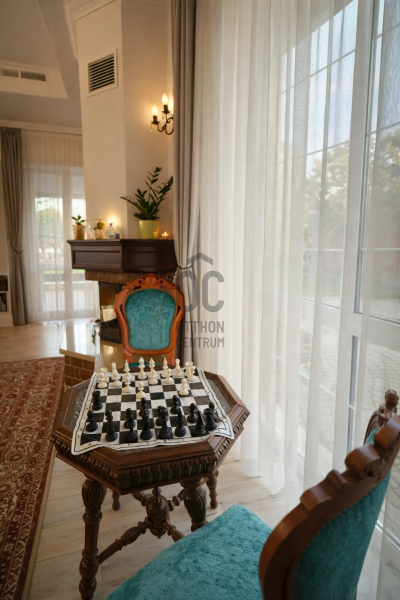 A mennyezetet klasszikus stukkó díszítés és elegáns díszlécek emelik ki, amely a modern klasszikus építészeti stílus egyik meghatározó eleme.