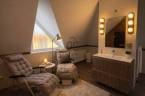 Az emeleti fürdőben egy 6 személyes finn szauna került kialakításra pihenőágyakkal.