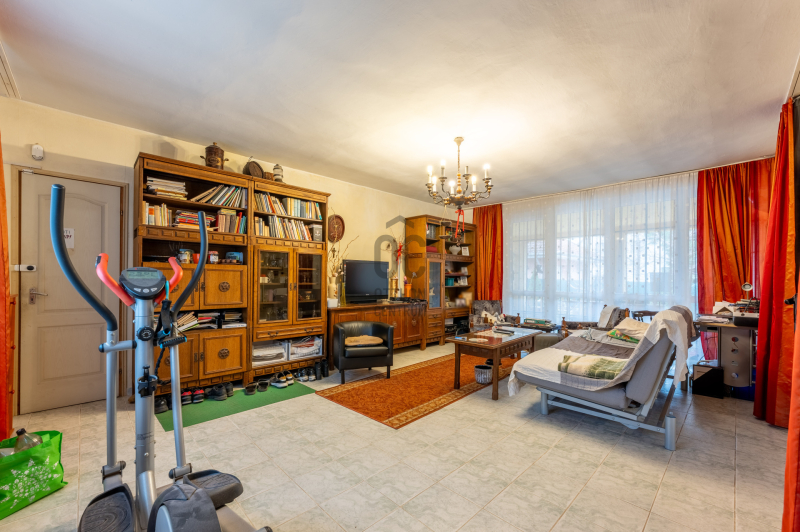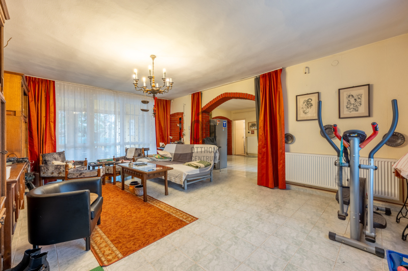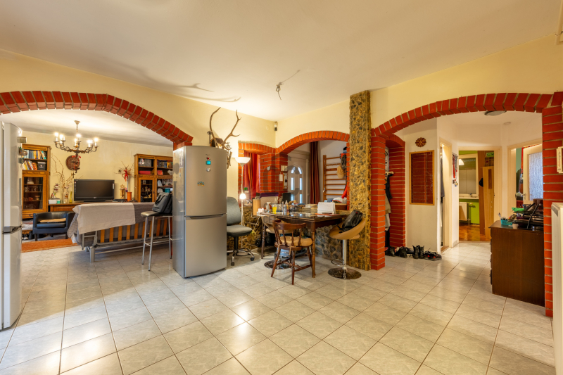 A ház 1996-ban épült, jól átgondolt alaprajzzal, praktikus térkapcsolatokkal. A telek két utcafronti bejárattal rendelkezik, egyik oldalon a 23 m²-es garázzsal, ahonnan közvetlen átjárás nyílik a lakótérbe – ez különösen kényelmes a mindennapokban.