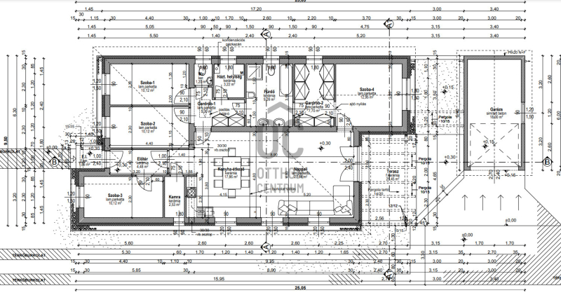 A 122 m² lakóterű ingatlan egyik legnagyobb előnye a hatalmas, világos nappali–konyha–étkező, amely a családi élet központja lehet. Innen közvetlen kapcsolat nyílik a 25 m²-es teraszra, így a belső és külső tér harmonikusan összekapcsolódik.