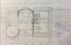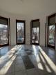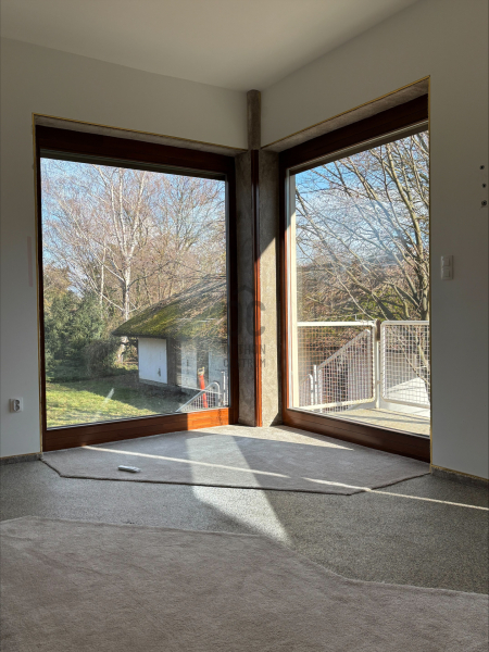 Az első emeleten jelenleg egy 61,4 m²-es egybefüggő nappali tér található, ugyanazokkal a félköríves, nagy üvegfelületekkel, mint a földszinten.