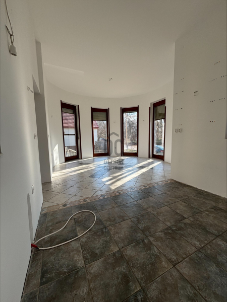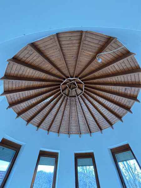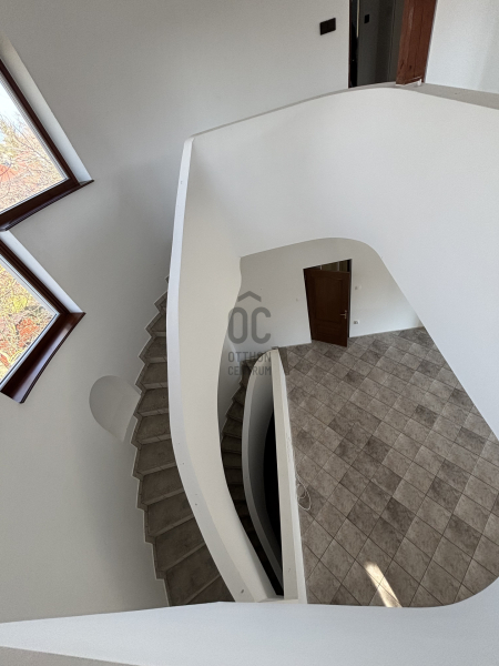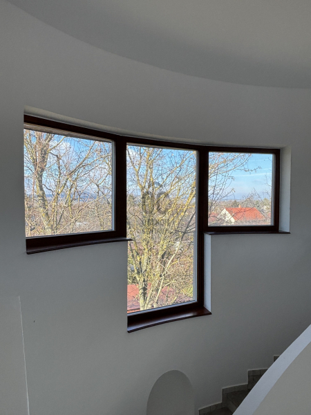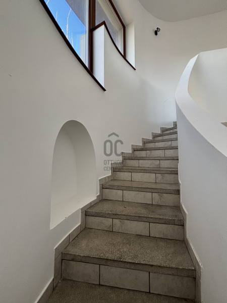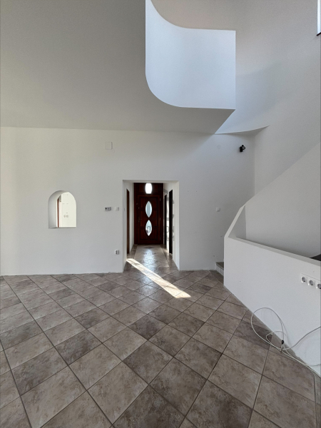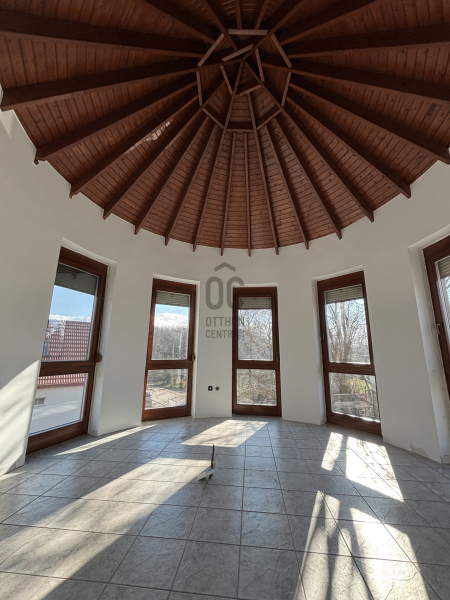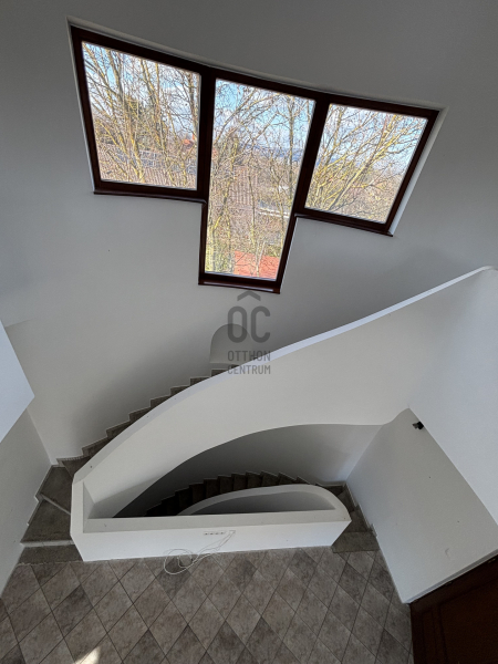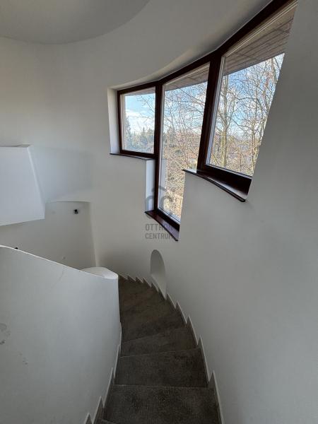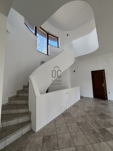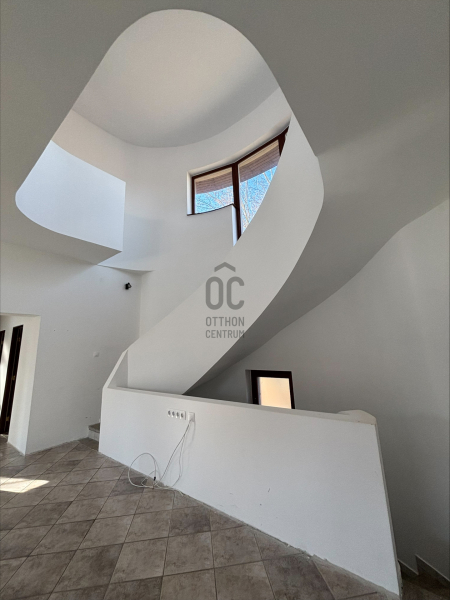 A ház már kívülről is figyelemfelkeltő: tornyos kialakítása, egyedi arányai és karakteres megjelenése különleges arculatot ad az ingatlannak. Belül a térformálás szinte szoborszerű: a csigaszerű, exkluzív lépcső, a fa berakásos, kupolaszerű étkező és az íves vonalvezetések Makovecz-hangulatot idéző, meleg, természetközeli atmoszférát teremtenek.