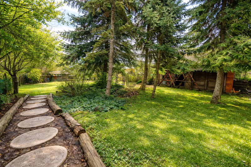 • A gondosan ápolt kertet dísznövények és fenyők teszik hangulatossá, az automata öntözőrendszer és az ásott kút pedig folyamatosan biztosítják a zöld környezet fenntartását.