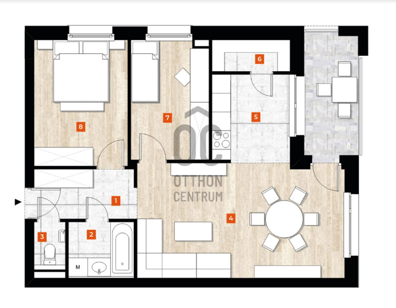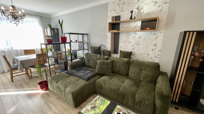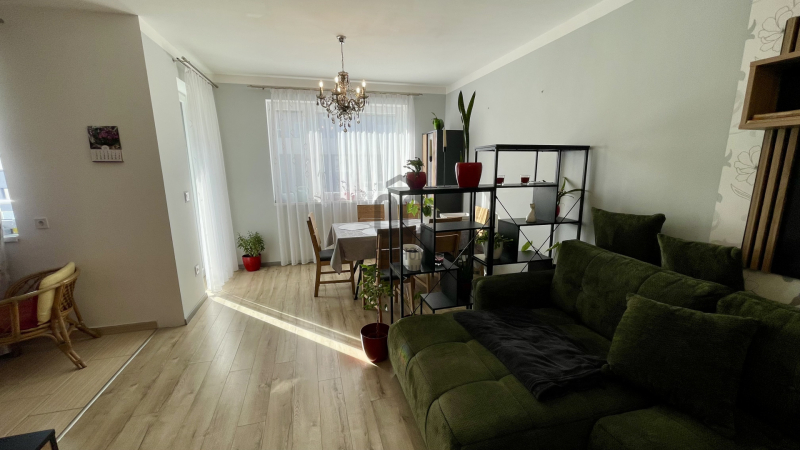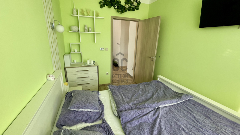 Az ingatlan előteréből nyílik a 2 hálószoba, a fürdőszoba és a különálló WC. A nappali-étkező a konyhával egy légtérben található.