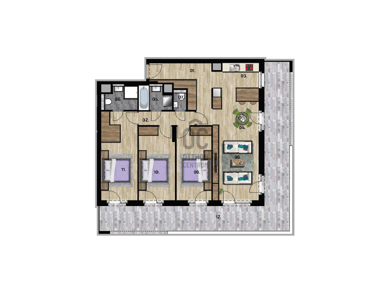 A lakás alaprajza, nappali + három hálós kialakítású, amely családok számára is ideális.