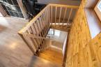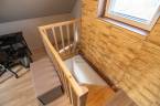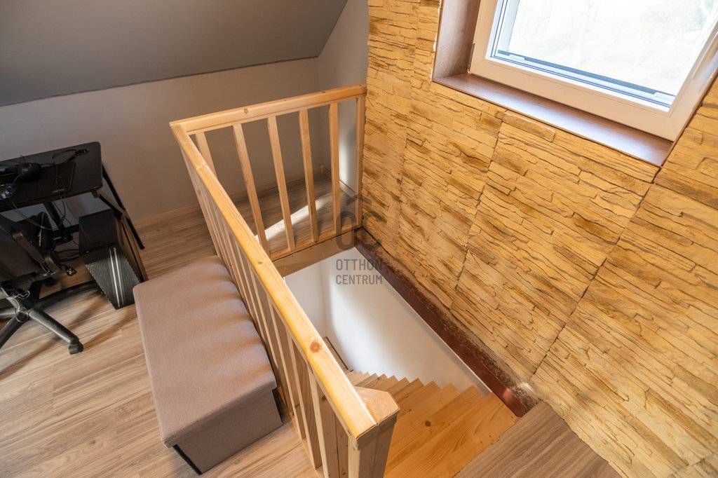A házba belépve a nappaliba érkezünk, jobbra a konyha és a fürdőszoba található. A bejárati ajtótól balra a lépcsőt találjuk, ha felmegyünk rajta a beépített tetőtérbe érkezünk, ami jelenleg hálószobaként funkcionál.