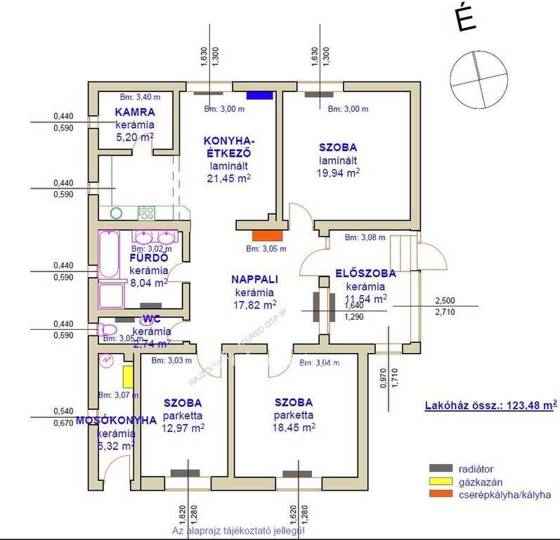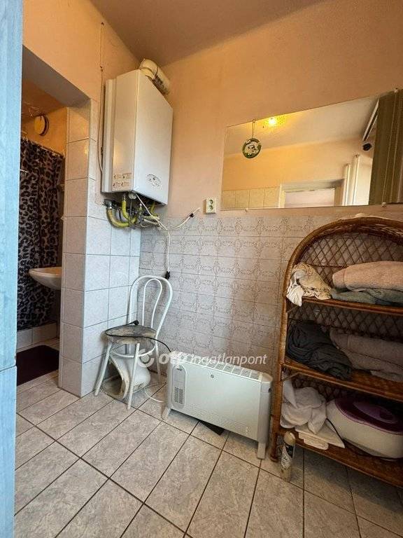 Fűtés: kombi gázkazán lapradiátorokkal és 1 db cserépkályha, hűtő-fűtő klíma (3 db).