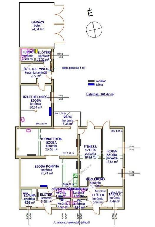 Helyiségek: a képek között található alaprajz szerint két lakrész van, elől egy régebbi 123,48 m2 (lakóház), hátul önálló bejárattal még további két egység egy épületben: 161,87 m2 (üzletház).