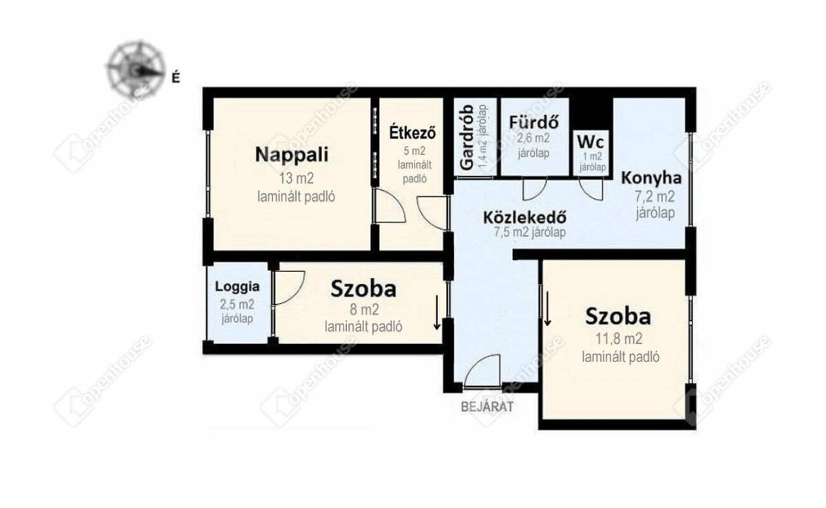 - a szobákban laminált padló, a többi helyiségben járólap van, a vezetékék is cserélve lettek