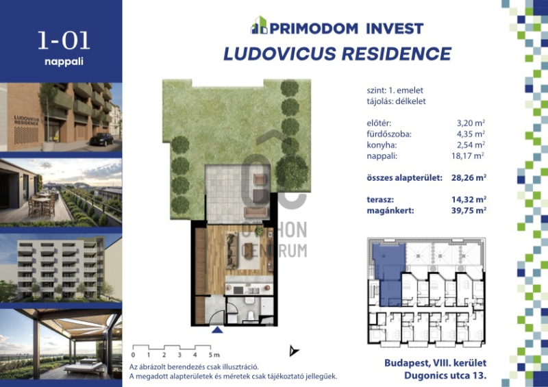 Az épület a Ludovika Huszárlovarda szomszédságában található. A Dugonics utca a VIII. kerület egyik csendesebb mellékutcája az Orczy-negyedben, amely az elmúlt években folyamatos rehabilitáción megy keresztül. A környéken egyre több fejlesztés indul, amely tovább növeli a városrész vonzerejét a lakók és a befektetők számára. A közelben található az Orczy-kert, az ELTE Füvészkert, valamint több egyetem és jó tömegközlekedési kapcsolat, ami különösen vonzóvá teszi a területet bérbeadási és befektetési szempontból.