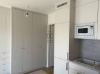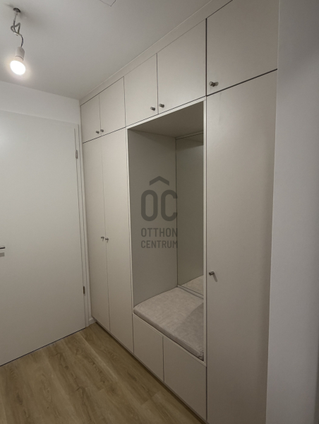A tér és helykihasználás rendkívül fontos szerepet kapott a lakásban, így minden beépített bútor mennyezetig ér. Kasmír színű beépített bútor, fával ötvözve került kialakításra az előszobában, fürdőben, konyhában + praktikus étkező asztal illetve a nappaliban is.