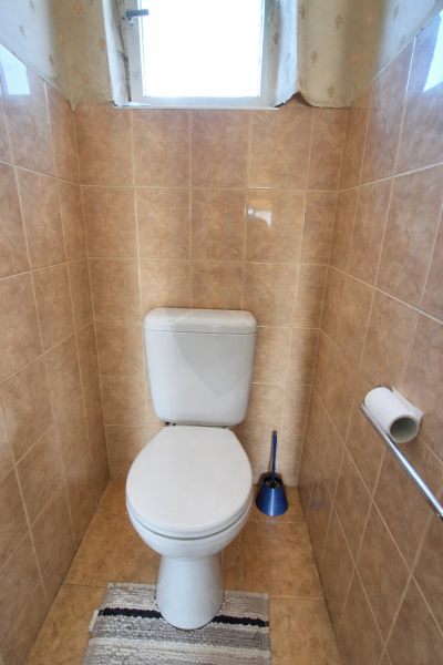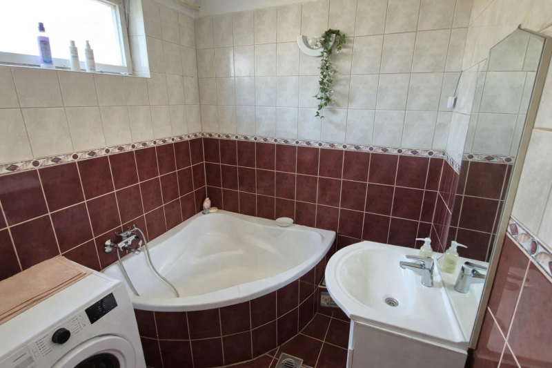 A fürdőszoba és a mellékhelyiség külön helyiségben található, ami egy családi ház esetében kifejezetten praktikus.