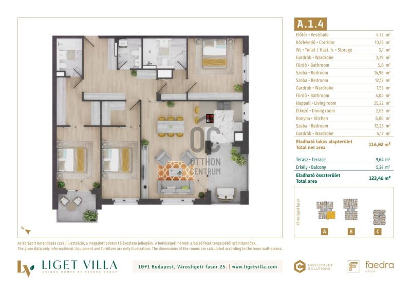 A pesti diplomatanegyed legszebb utcájában épül, a megjelenésében, műszaki tartalmában és a lakáskínálata tekintetében egyaránt unikális, Liget Villa Lakópark. Az épületbe érve, egy elegáns lobby és recepcióra érkezünk majd. Innen a három épületet egy kerti úton, passzázs köti majd össze. A tervezés során nagy hangsúlyt kapott a családi igényekre tervezett lakás minőségi használhatósága. Ablakos konyhák, master bedroom-ok, dupla fürdőszobák, gardrób és háztartási helyiségek is helyet kapnak a lakásban. Kiemelten jól bútorzható, két irányba tájolt lakások kerülnek kialakításra. A földszinti lakásokhoz 50-100 m2-es privát kertek, míg a közös területeken tájépítész által tervezett reprezentatív kertet alakítunk ki. A lakásokban mennyezeti hűtés-fűtés biztosítja a téli-nyári kellemes komfortérzetet. A nyílászárók 3 rétegű üveggel, alu-fa kivitelben kerülnek beépítésre. A lakások ára tartalmazza alapárban az alu elektromos redőnyöket és okosotthon kiépítést is. Magas minőségű olasz és spanyol hidegburkolatválasztékban akár 60x60 cm-es lapok is válaszhatóak majd. A fa parketta és az átlag feletti minőség szaniterek, szintén alapárban válaszhatóak a lakásokba. Az épületek alatti mélygarázsban gépkocsibeállók és tárolók kerülnek kialakításra.