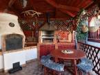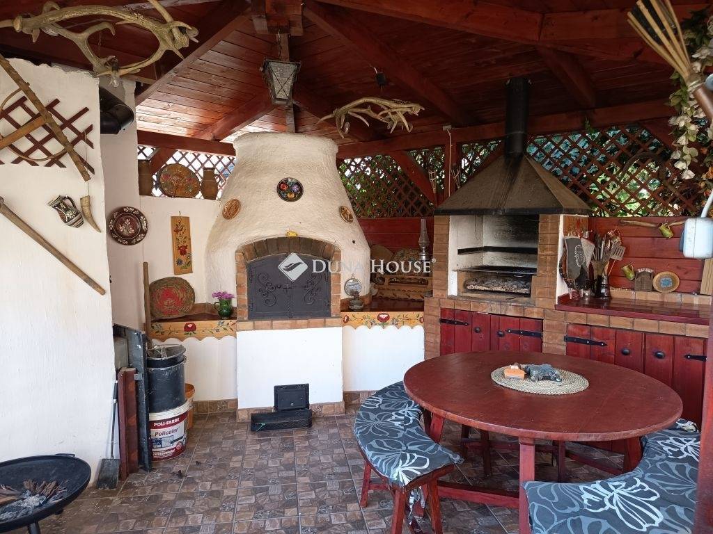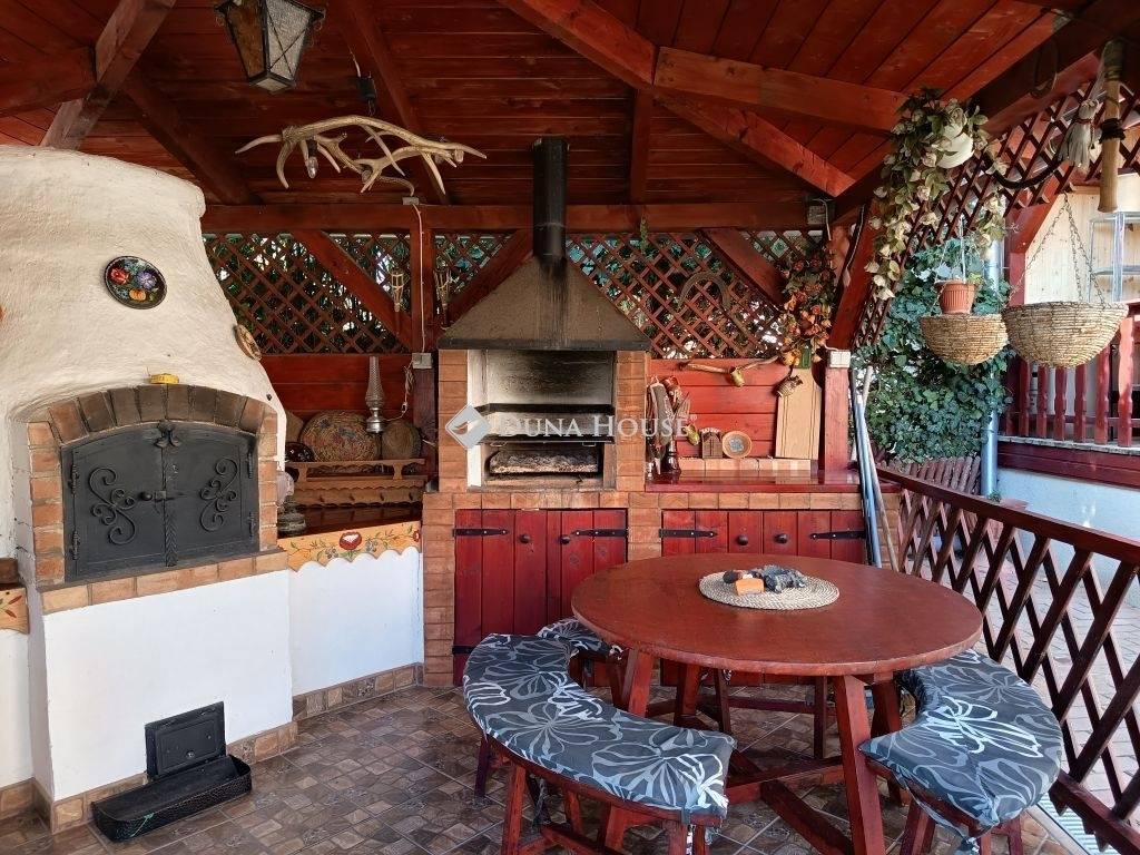 A kertben egy fedett kerti helyiség grillel és kemencével várja a családi sütögetéseket és baráti összejöveteleket.