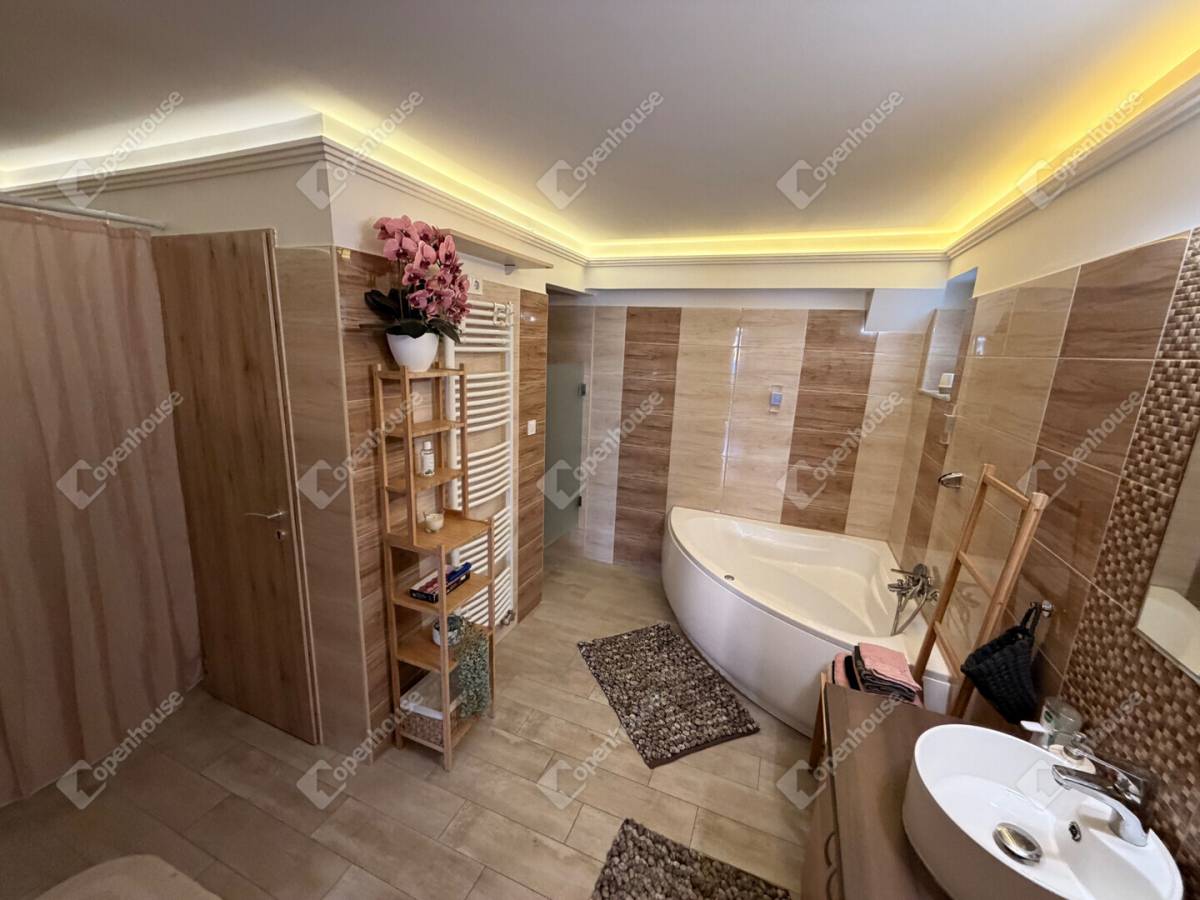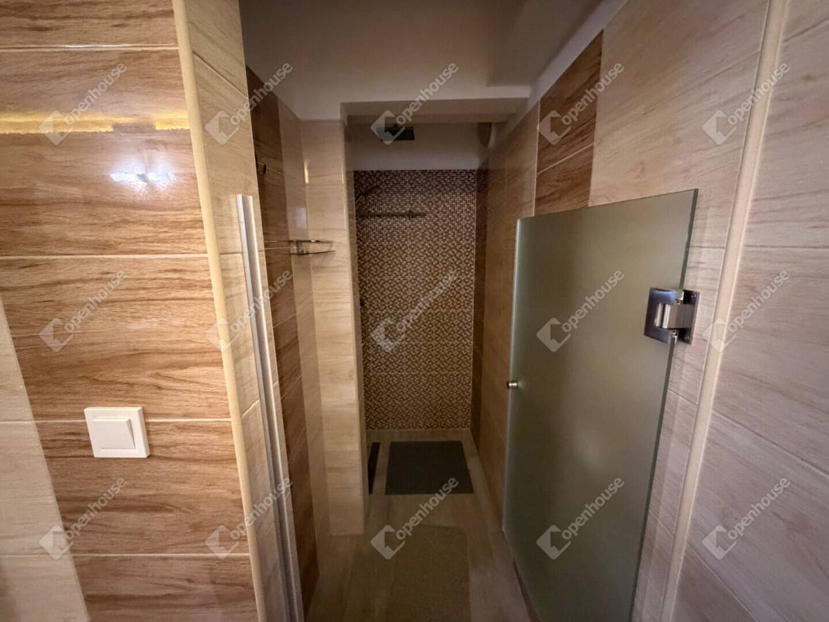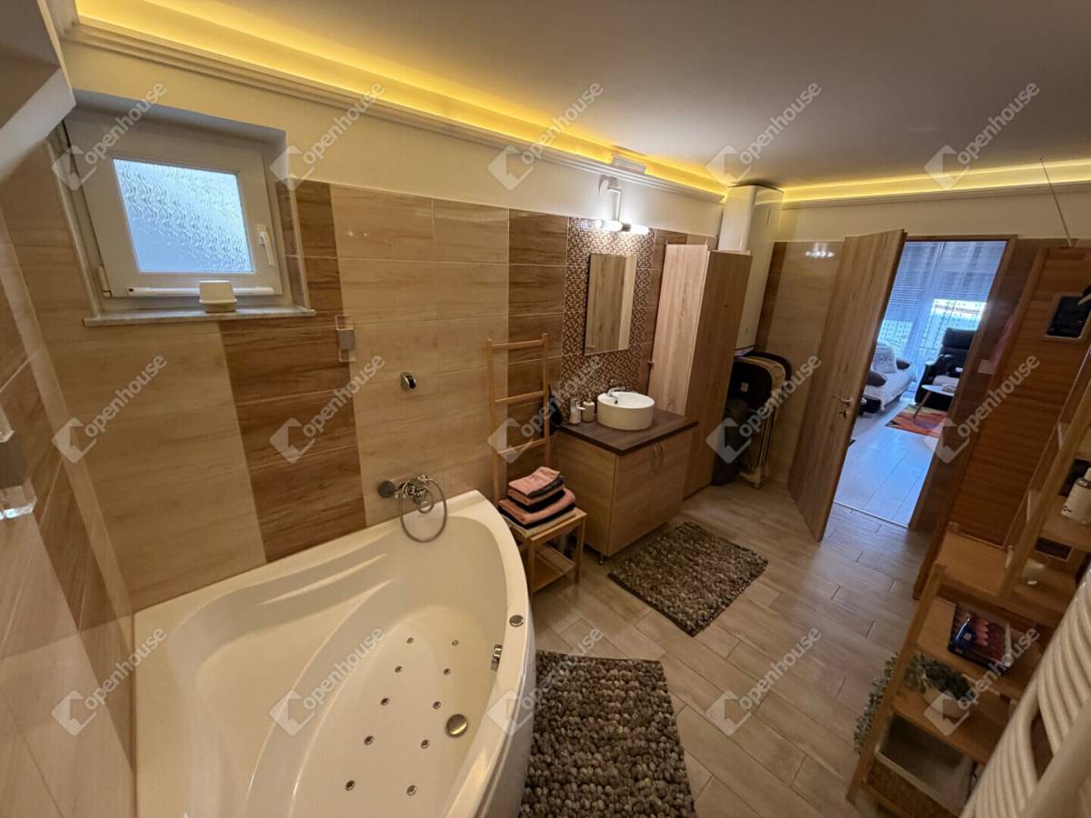 Az ingatlan egyik különleges értéke a wellness élményt nyújtó fürdőszoba, ahol saját szauna gondoskodik a tökéletes kikapcsolódásról. A fürdőszobában külön kialakított tusoló is helyet kapott, így a mindennapi kényelem minden részletében megvalósul.