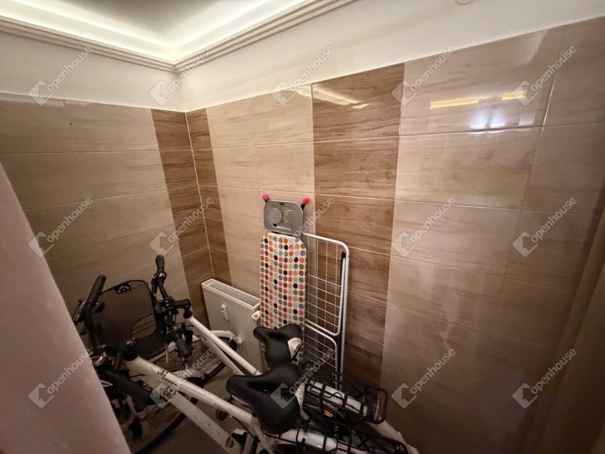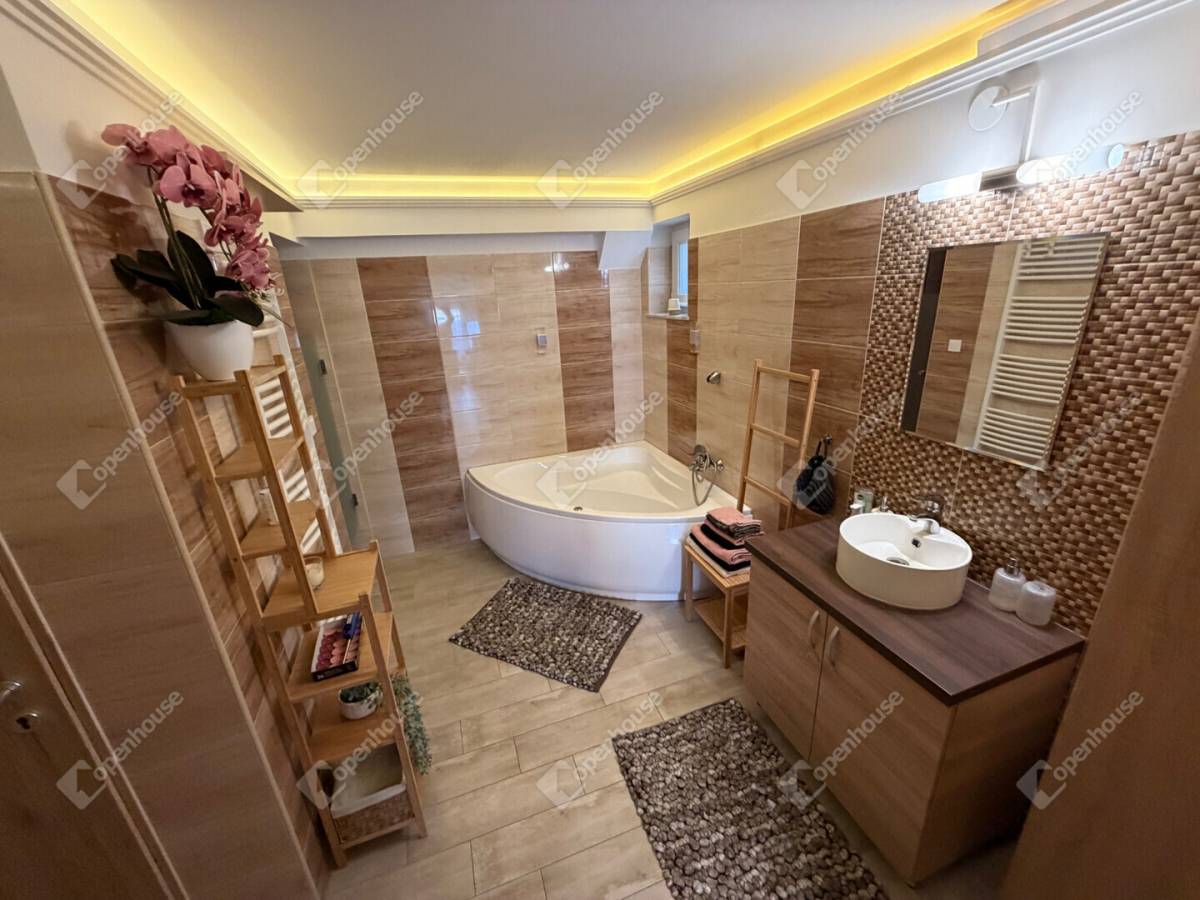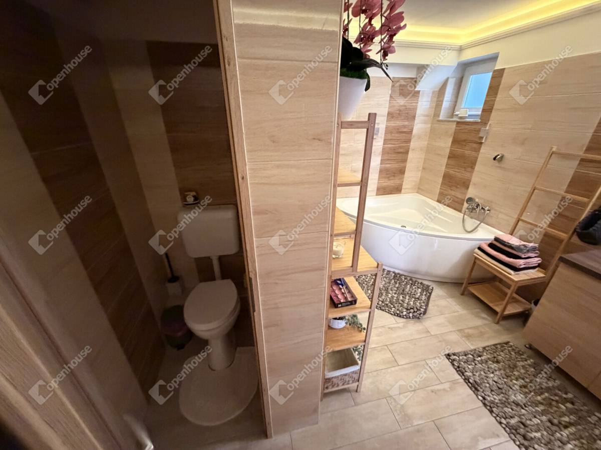 Az ingatlan egyik különleges értéke a wellness élményt nyújtó fürdőszoba, ahol saját szauna gondoskodik a tökéletes kikapcsolódásról. A fürdőszobában külön kialakított tusoló is helyet kapott, így a mindennapi kényelem minden részletében megvalósul.