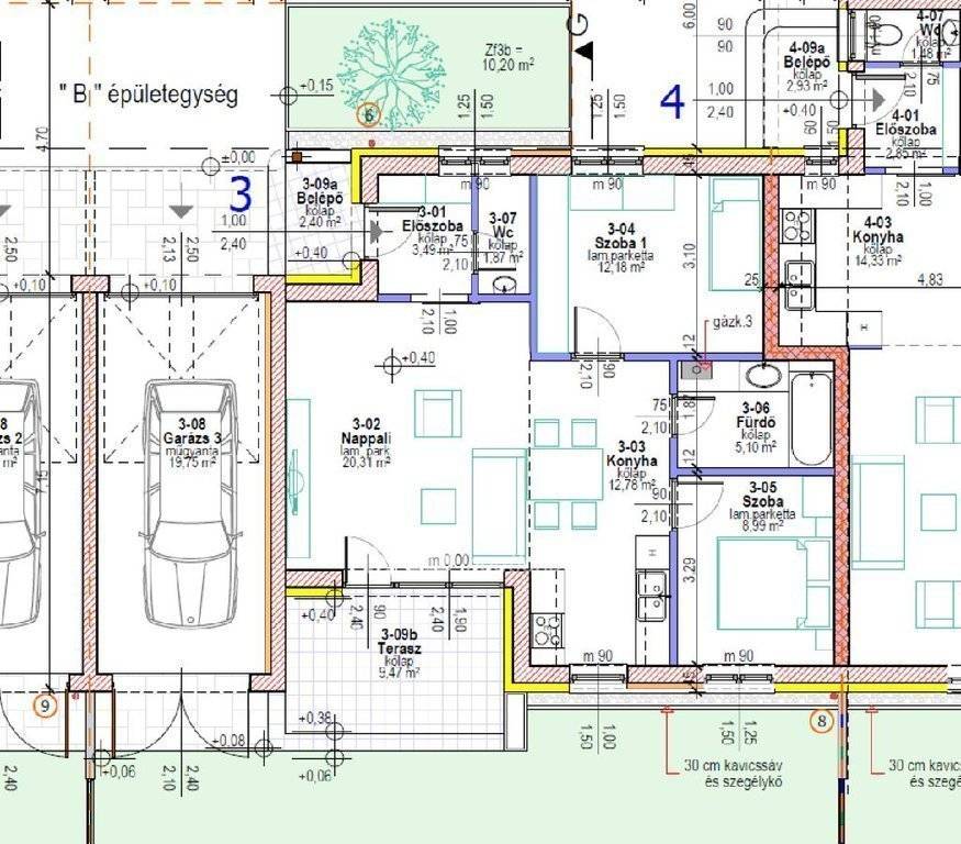 Békéscsabán 84,5 nm-es, ÚJ ÉPÍTÉSŰ társasházi lakás, 283,3 nm-es kizárólagos használatú telekhányaddal eladó. Az ingatlan a belvároshoz közel, csendes mellékutcában helyezkedik el. A telken 4 db önálló lakás épül. A 3-as lakás, amit eladásra kínálok földszintes, modern épület, amelyben amerikaikonyhás nappali, két hálószoba, előszoba, fürdőszoba, wc, található, valamint 19,8 nm-es garázs, 2,4 nm-es belépő, 9,5 nm-es terasz tartozik még hozzá. A zöldfelület 108 nm. A szobák laminált parkettások, az otthon melegét gáz cirkó kazán biztosítja padlófűtésen keresztül. Az épület energetikája A++ -os, 1,2 Kw napelem kiépítése engedélyeztetve, 2db klíma előcsövezve. Egyéb műszaki adatokért, valamint további információkért kérem keressenek. Van még lehetőség kisebb változtatásokra, valamint a burkoló anyagok, szerelvények kiválasztására is. Birtokbaadás 2027 első negyedév. Ügyfeleinknek jogi és ingyenes pénzügyi szolgáltatást nyújtunk.