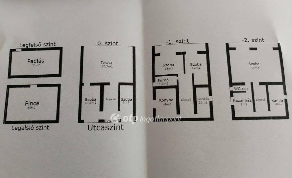 - Alsó szint: 35 m2-es nappali, WC, kazánház és kamra. Innen nyílik a lejáró a pincébe és a kijárat a 798 m2-es kertbe.