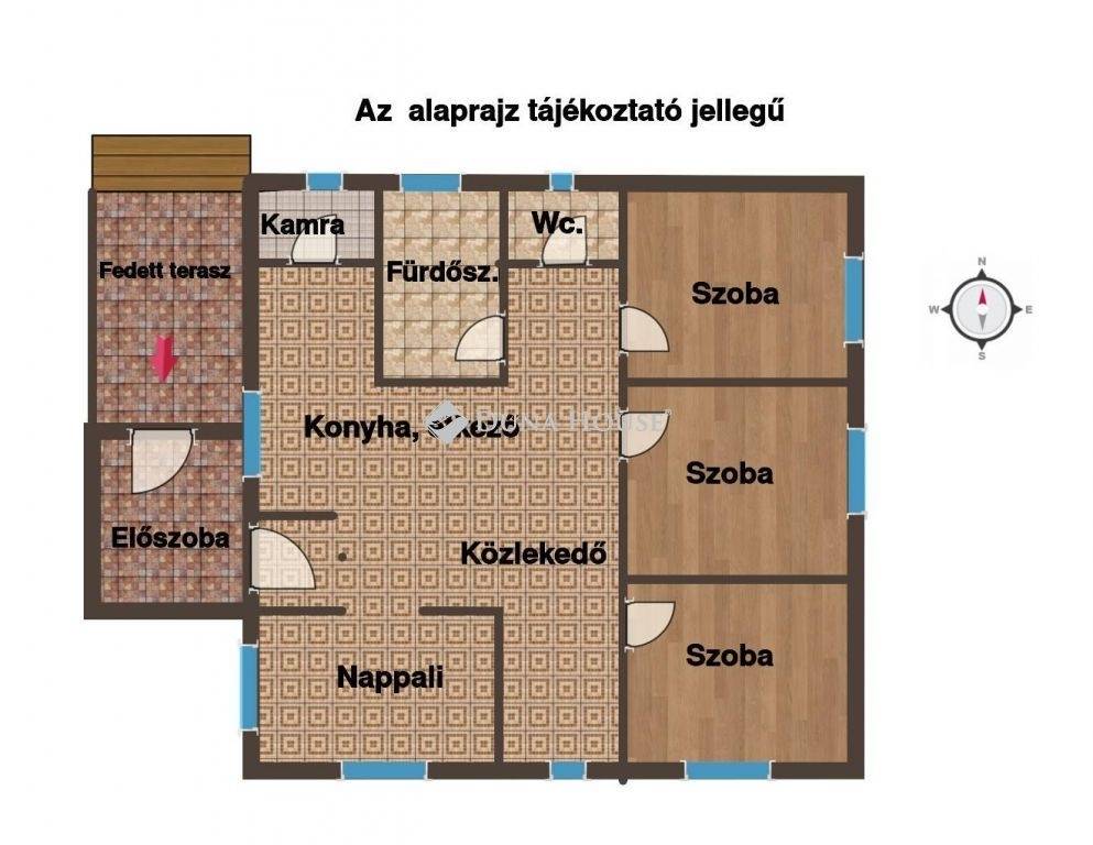 A házban előszoba, nappali+ 3 szoba, konyha-étkezővel, kamra, sarokkádas fürdőszoba, külön Wc. került kialakításra.
