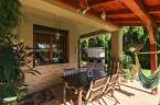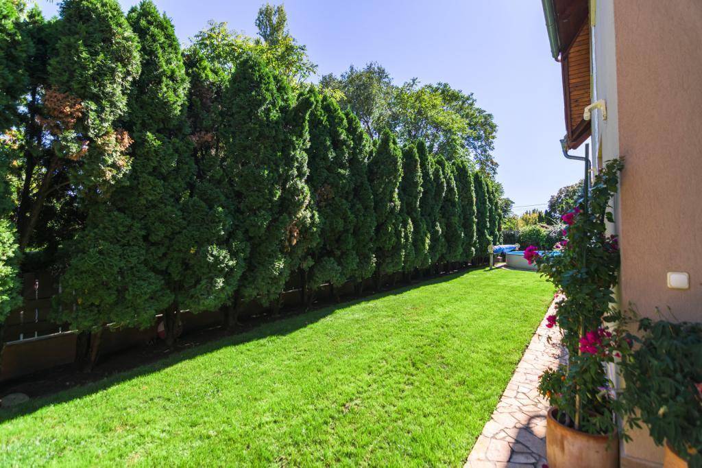 A gondozott kert igazi pihenőkertként funkcionál: privát medence, fedett grillterasz, zöldfelületek és virágos növényágyások teszik teljessé a kertvárosi életérzést. A kertben egy különálló faház-tároló is megtalálható, ideális kerti eszközök vagy szezonális holmik elhelyezésére.