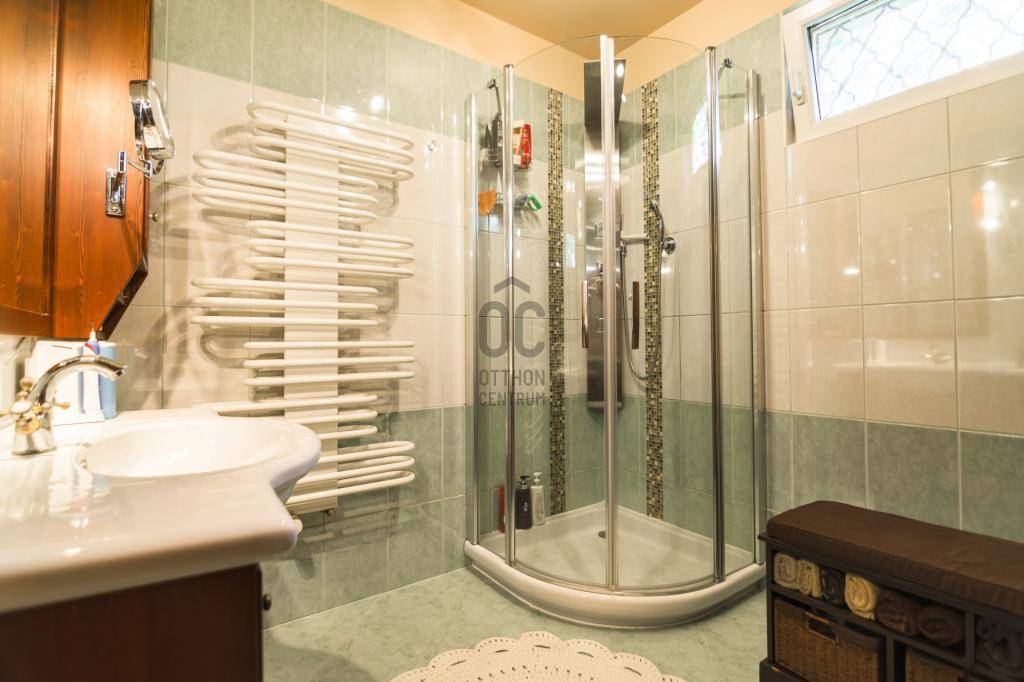 A házban szintenként egy-egy fürdőszoba és külön WC található, a földszinti fürdőben szauna is beépítésre került, ami tovább növeli a komfortérzetet. Ezen kívül egy külön háztartási helyiség/mosókonyha, egy gépészeti helyiség, valamint egy praktikus spájz is rendelkezésre áll.