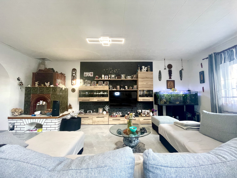 - kényelmes, tágas méretű nappali, amely split klímával felszerelt, nagy üvegfelülettel, fa tüzelésű kályhával, és 23 m2-es fedett terasz csatlakozással rendelkezik