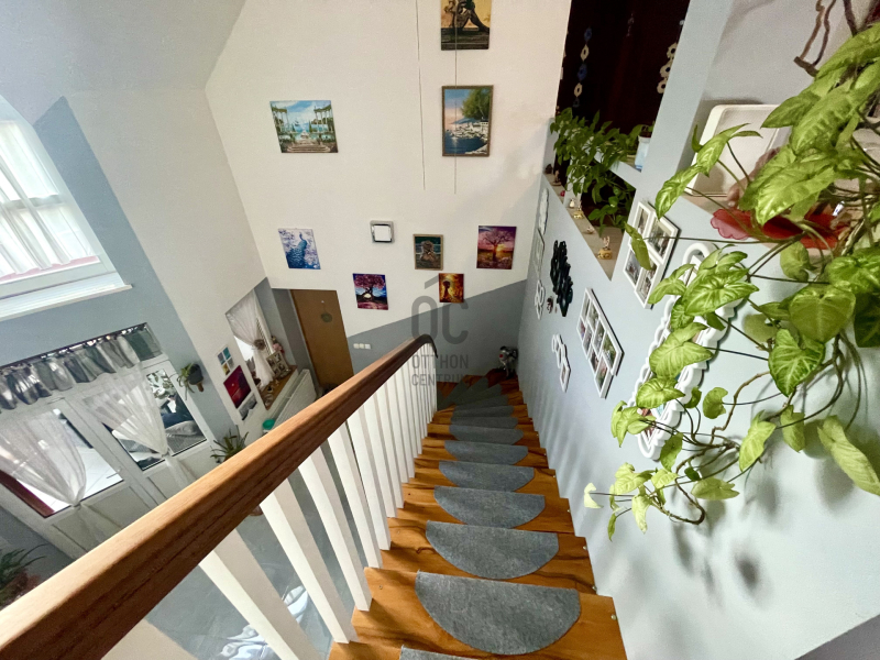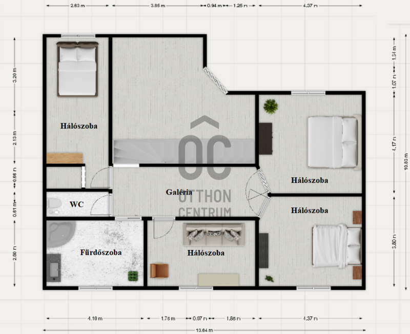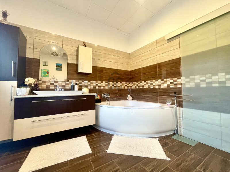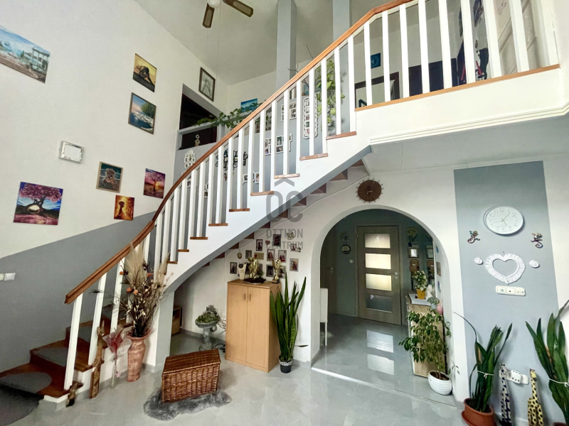 - széles lépcsősor vezet a tágas emeleti galériára, amelyből 4 hálószoba egy fürdőszoba és külön mellékhelyiség került kialakításra