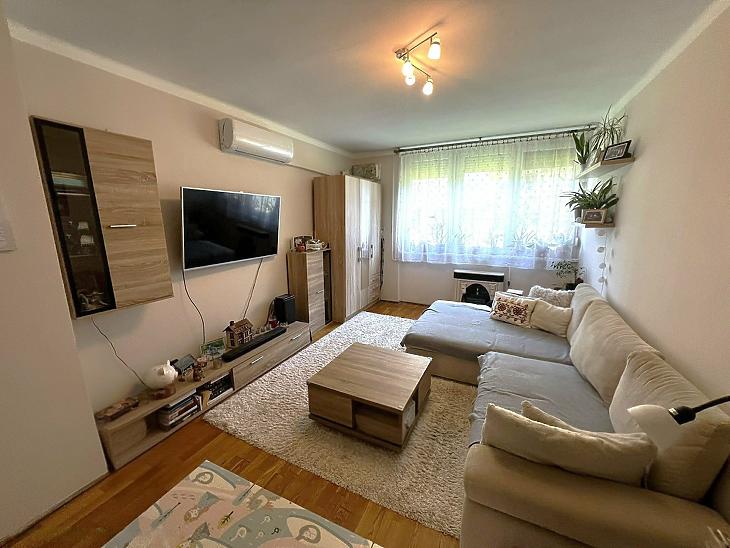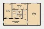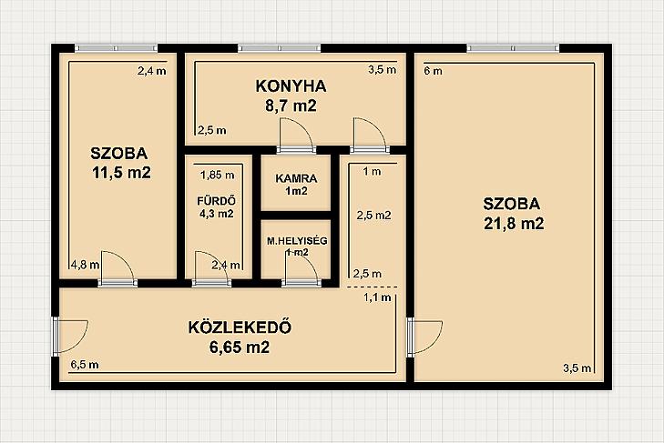 2 szoba, ablakos konyha, zuhanyzós fürdőszoba, mellékhelyiség, kamra.