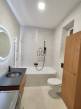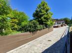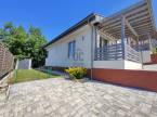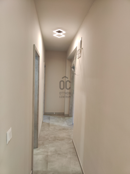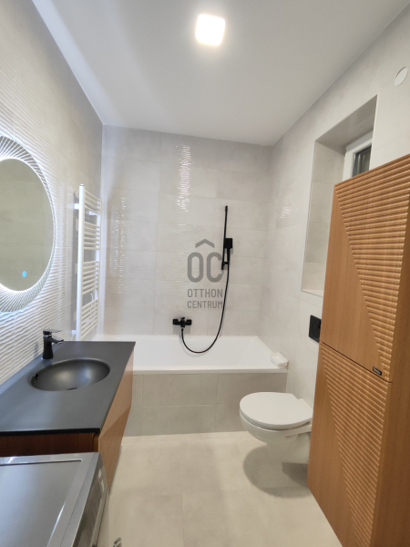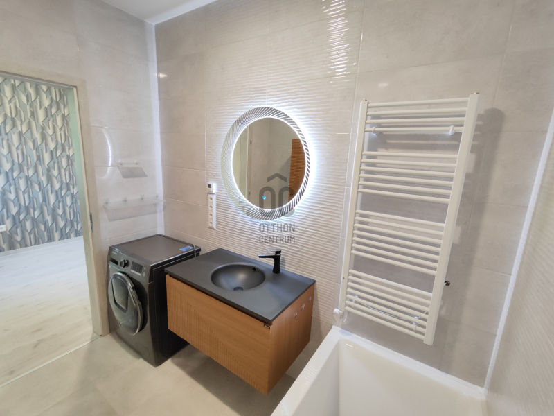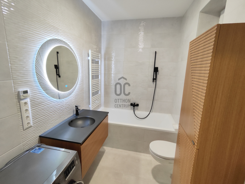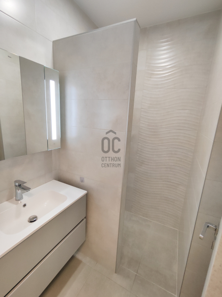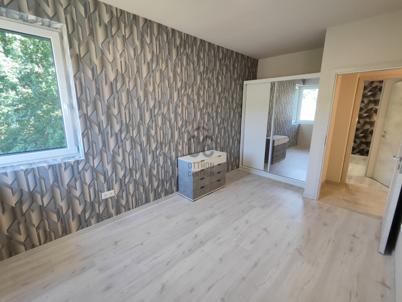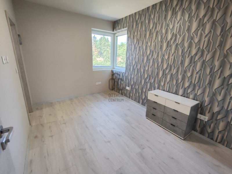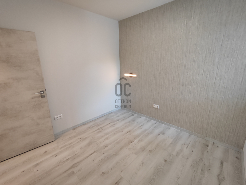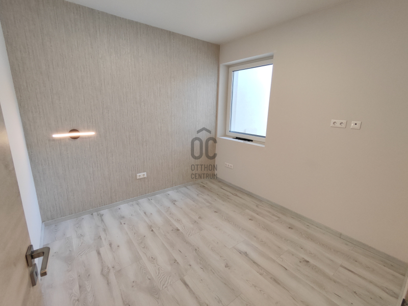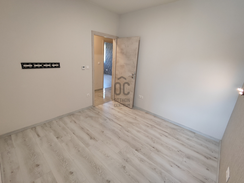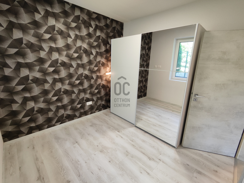 A világos nappaliból közvetlen kertkapcsolatos, épített terasz nyílik, amelyhez gondozott zöldfelület és automata locsolórendszer tartozik.