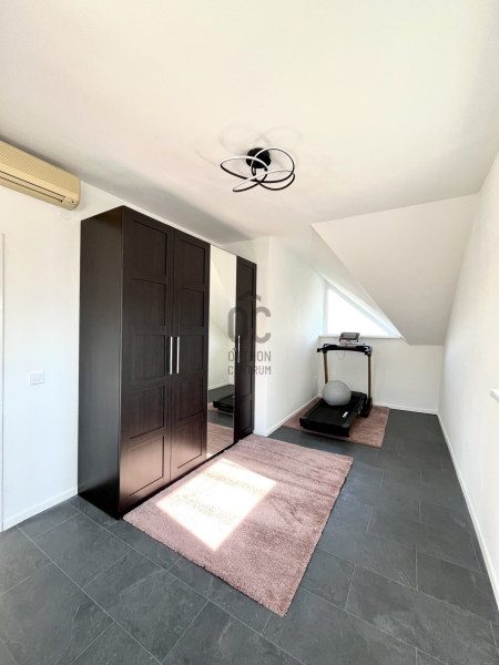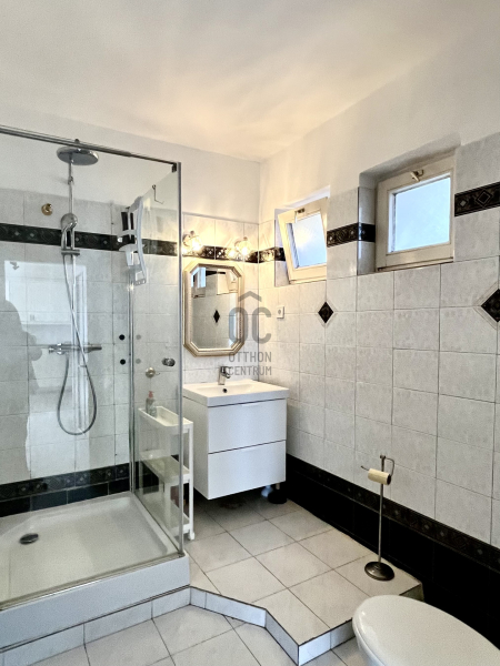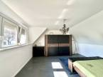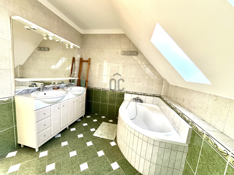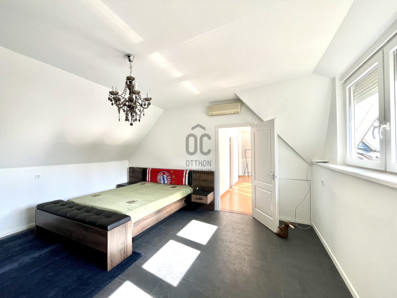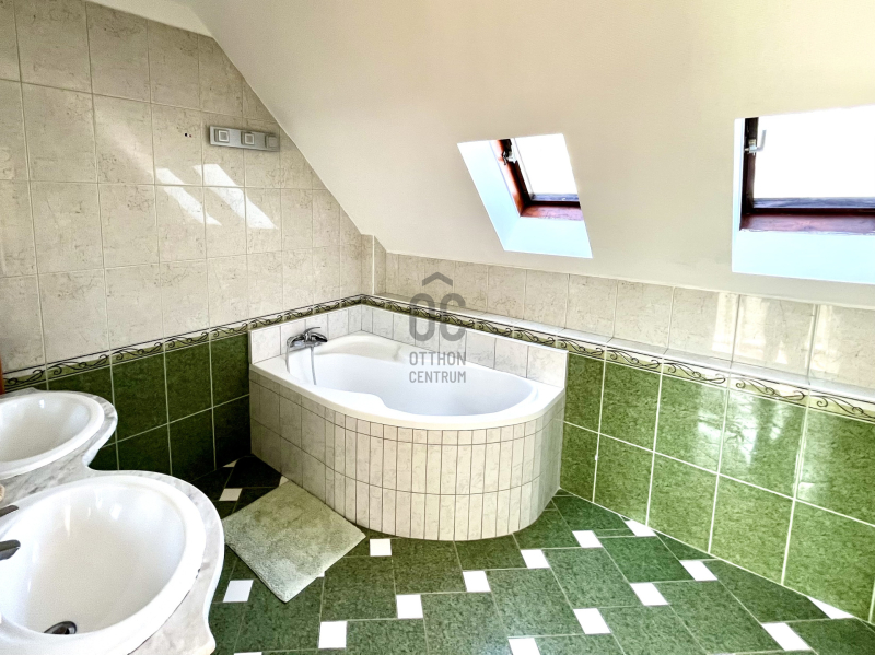 A tetőtérben három nagyméretű, különnyíló hálószoba található egy kádas és zuhanyzós fürdőszobával.