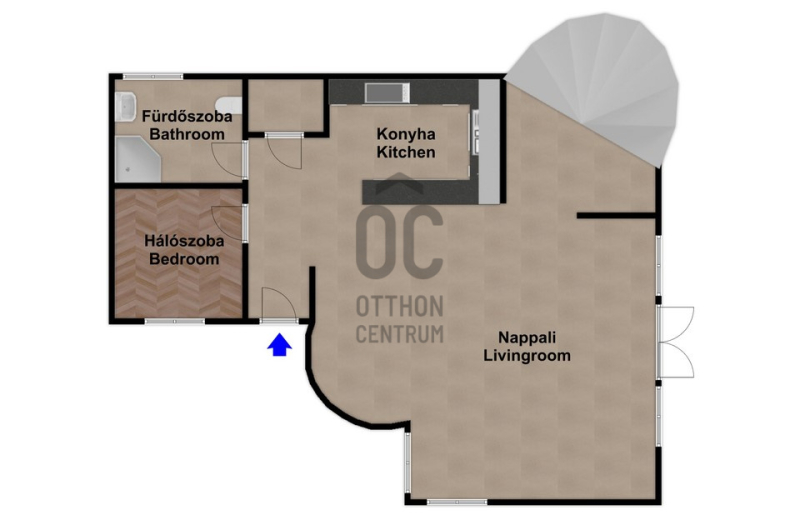 Az emeleten egy tágas, napfényes, hatalmas terasszal rendelkező amerikai konyhás nappali, egy tároló, egy hálószoba, és egy zuhanyzós fürdőszoba kapott helyet.