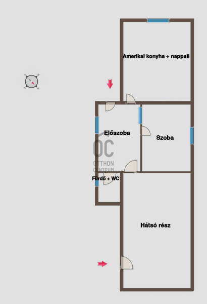 A fő épület, 2 szoba, konyha, a kis ház, egy szoba, kamra elosztással rendelkezik.