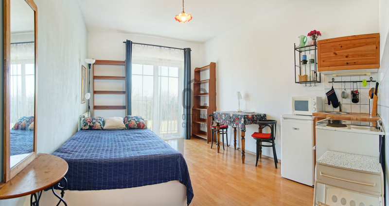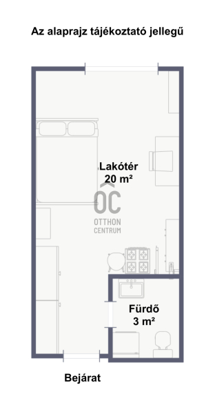 - alapterülete 23 m², egy szobás, nappali–konyha + fürdőszoba elrendezéssel