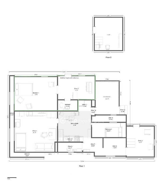 A belső elrendezés praktikus és akár kétgenerációs kialakításra is alkalmas vagy kisebb üzlethelyiség kialakítására, de akár albérlő számára is ideális lehet. Összesen 4 egész szoba és 1 félszoba található az ingatlanban. A földszinten és az emeleten is jól elkülöníthető életterek kerültek kialakításra. Van egy külön bejáratú lakrész, amely rendelkezik saját mérő órákkal (víz, villany).Ebben a részben egy 18 nm-es szoba, egy 11 nm-es konyha (előszobával), valamint egy 2,5 nm-es fürdőszoba kapott helyet. Amely igény szerint összenyitható a nagy ház résszel. A további helyiségek között megtalálható egy 21 nm-es szoba, egy 10 nm-es és egy 11 nm-es szoba (utóbbi az emeleten), egy 6 nm-es félszoba, egy 12 nm-es konyha, egy 2,8 nm-es fürdőszoba, valamint egy 8,7 nm-es közlekedő. A 9,6 nm-es terasz kellemes kültéri pihenőteret biztosít.