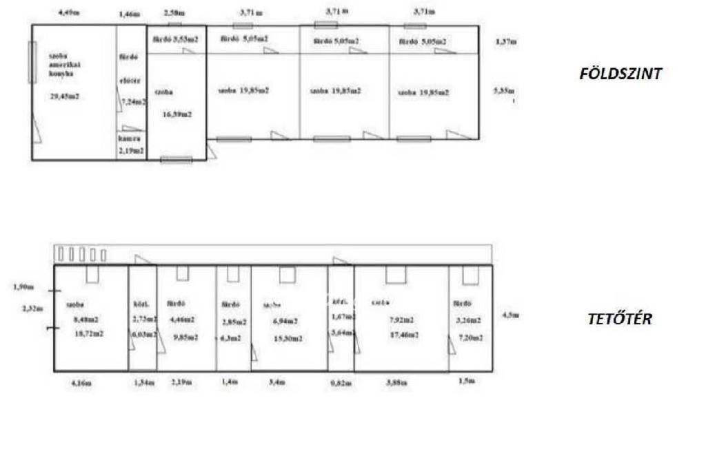 Bács-Kiskun vármegye, Solt belvárosi részén 200 m2 hasznos alapterületű kétszintes apartmanház a hozzátartozó 8000 m2 nagyságú telekterülettel, 16343 m2 telken eladó! A kereskedelmi egység a város központi részén található. A 2009-ben épült apartmanházban jelenleg egy 7 szobából álló, több férőhelyes munkásszállás üzemel, szobánként fürdőszoba-WC helyiséggel, tartós bérleti formában. Az apartmanház falazata tégla, homlokzata 10 cm-es hőszigeteléssel és kőporral kivitelezett, a födém tégla- beton, hőszigeteléssel ellátott, tetőszerkezete fa, égetett cserép héjazattal borított. A külső nyílászárók REHAU típusú hőszigetelt műanyagok, a belsők normál fa szerkezetűek. A kétszintes apartmanház hét szobából, egy konyhából és egy étkezőből áll, minden helyisége járólappal borított. Az egységek fűtését és melegvíz ellátását több gázkazán, alternatív megoldásként vegyestüzelésű kazán biztosítja radiátoros hőleadással. Az apartmanházban több klíma is felszerelésre került. A telek ősfákkal tarkított, parkosított, az egész 1,6 hektár körben bekerített, az aszfaltozott út felől gépjárművek behajtására több kapubejáró és 50 férőhelyes belső aszfaltozott parkoló biztosított. Az apartmanház köré nyitott úszómedence és egy teniszpálya is megépítésre került. Az épületek állagmegóvása, egy részének átépítése megtörtént, a szobák felújítása folyamatosan zajlik. Az ingatlan komplett berendezésével együtt eladó, beleértve a vendégszobák bútorzatát és az udvari kiegészítőket egyaránt.