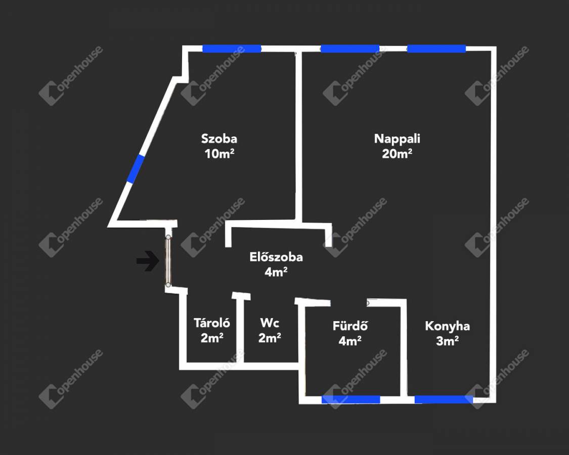 A 20 m²-es nappali tágas, a hálószoba külön nyílik.