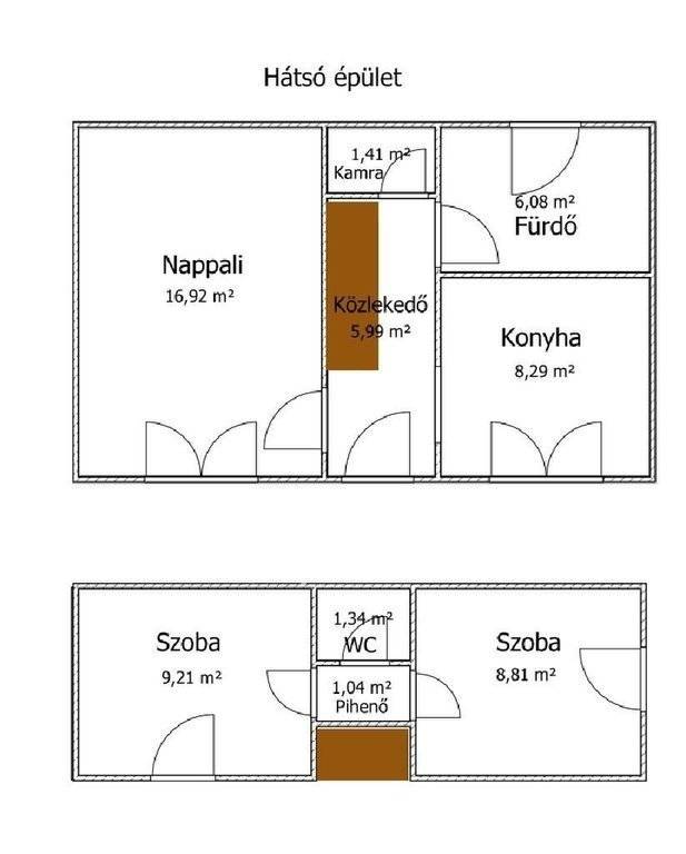 A főépület mögött kapott helyet egy 1984-ben épült, kétszintes, 75 m2-es kisebb családi ház, amely jó műszaki állapotú és akár azonnal használható lakóegységet biztosít. Az alsó szinten nappali, konyha - étkező, fürdőszoba és kamra található, míg a tetőtérben két szoba és egy WC került kialakításra. Az ingatlan gépészete a kornak megfelelő állapotú, a villamos hálózat bővítése megtörtént, a beépített és gépesített konyha pedig minden alapvető igényt kielégít. A fürdőszoba víz - és szennyvízvezetékeinek, valamint burkolatainak cseréje 4 évvel ezelőtt történt, a központi fűtést pedig egy két éves gázcirkó kazán biztosítja, míg a nyári időszakban klímaberendezés gondoskodik a kellemes hőmérsékletről.