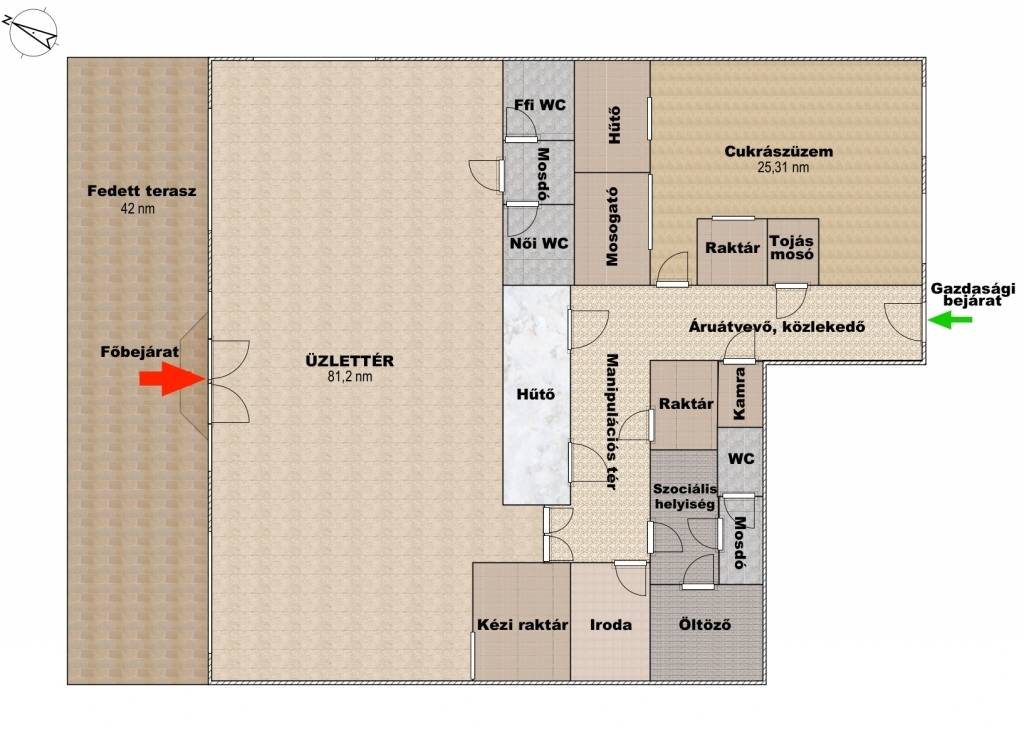 A jelenlegi kialakítás szerinti 81 négyzetméteres vendégtér 10 asztallal 40 vendég kiszolgálására ad lehetőséget, és tavasztól őszig a fedett teraszon további 12 db négyszemélyes asztal engedélyezett kihelyezésére is van lehetőség. Az ingatlanhoz tartozik egy 25 négyzetméteres cukrászüzem és számos kiszolgálóhelyiség, mint ahogyan az az alaprajzon is látható.