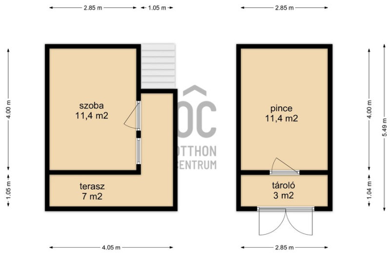 - Felső szinten egy 11,4 m2-es szoba és egy 7 m2-es terasz található.