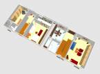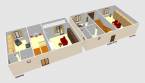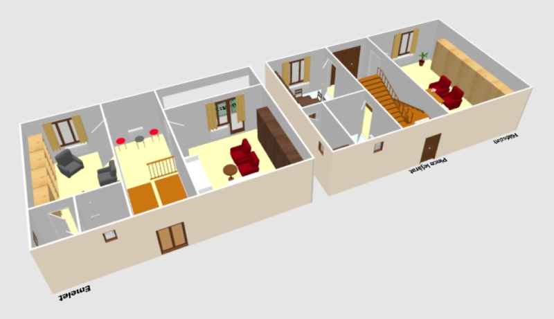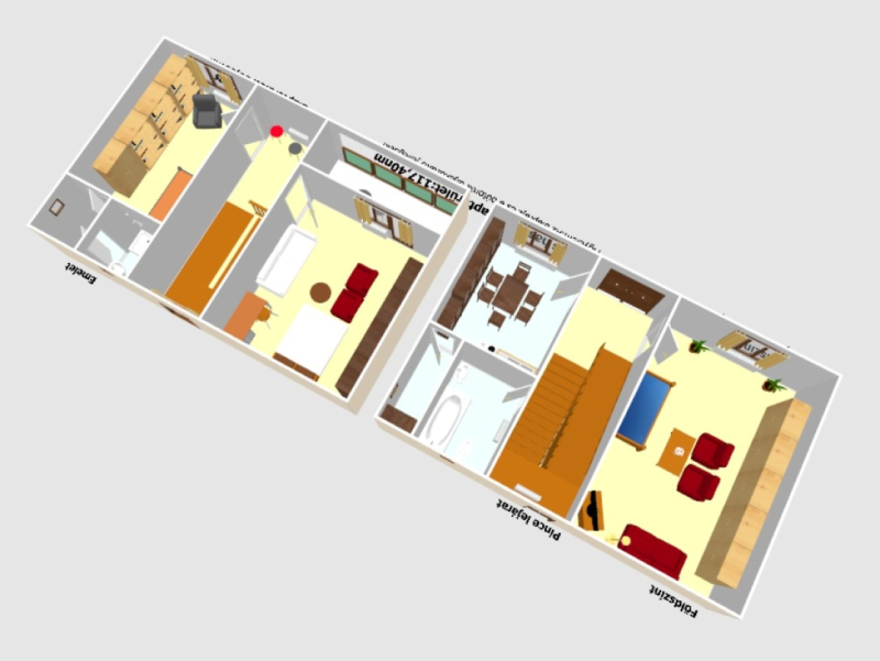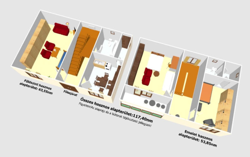 A főépület hasznos alapterülete 63,55+53,85= 117,40nm, melyben található: