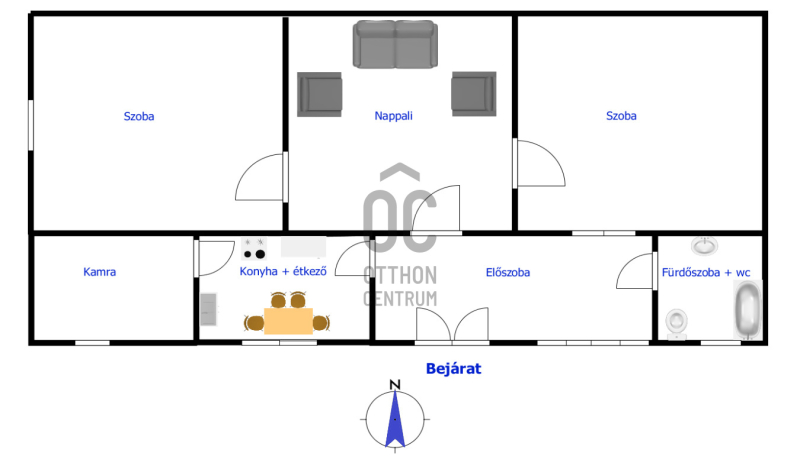 - 3 szoba, konyha étkezővel, kamra, előszoba, fürdőszoba egyben wc-vel található benne