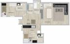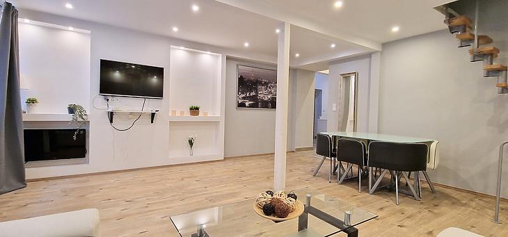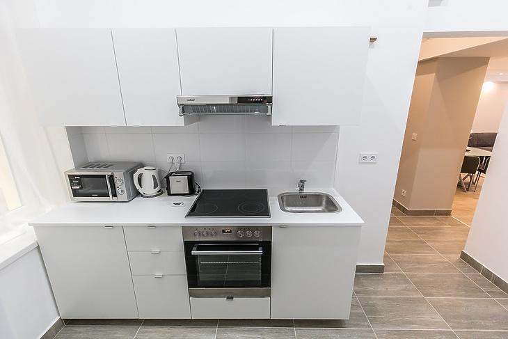 A lakásban tágas, különálló nappali és egy teljesen felszerelt, külön konyha is helyet kapott, így a közös terek kényelmesen használhatók anélkül, hogy zavarnák egymást a lakók. A háztartási helyiség további praktikusságot biztosít a mindennapokhoz.