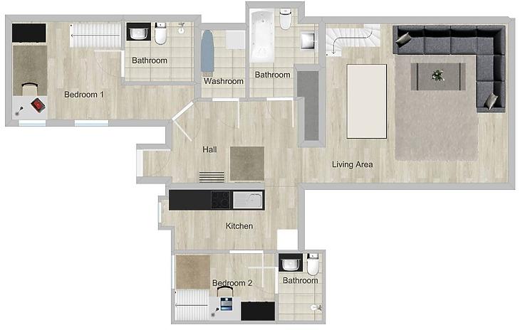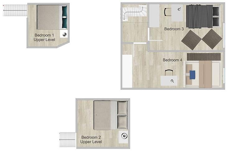 A lakás kiváló elosztásának köszönhetően 4 különnyíló hálószobával rendelkezik, mindegyik saját fürdőszobával, így minden lakó számára biztosított a teljes privát tér. Két szoba galériás fekvőrésszel kialakított, míg a másik két háló a felső szinten található.