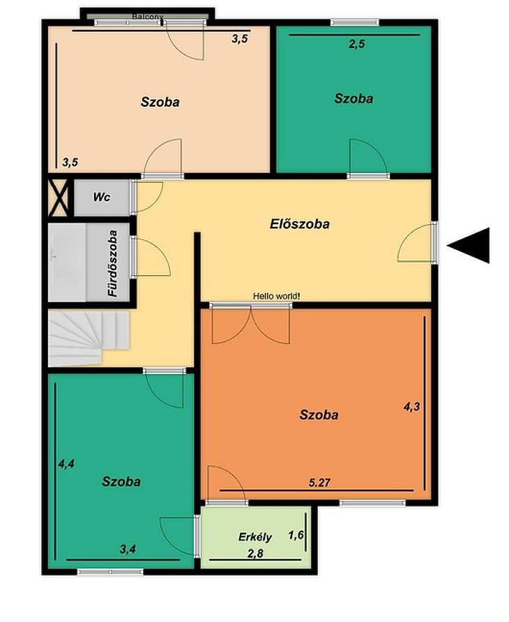 Emelet: előszoba, 3+1 félszoba, fürdőszoba, wc, erkély
