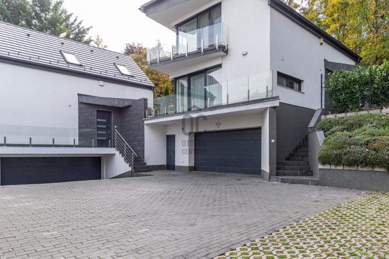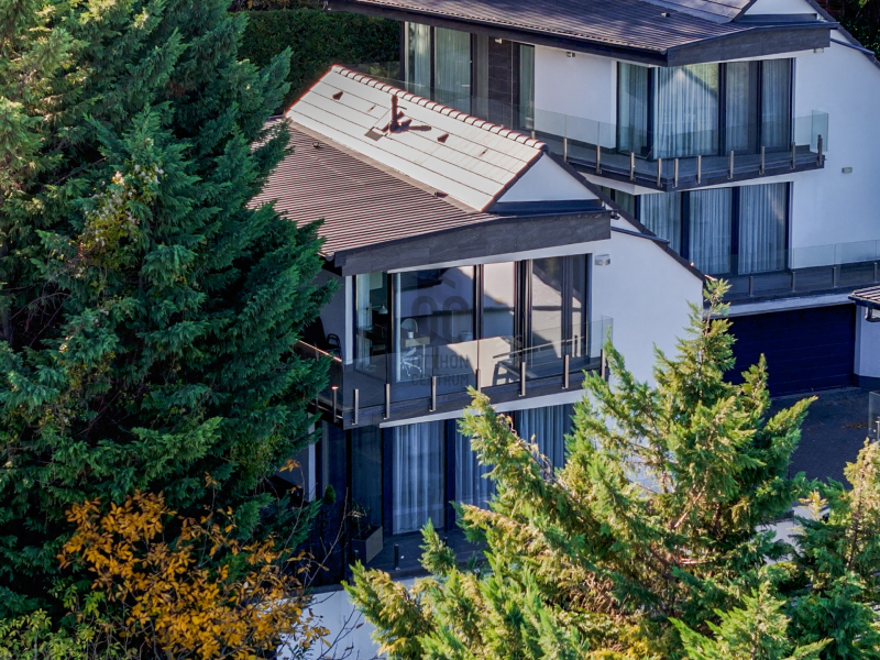 Az épület minden részletében az arány és a funkcionalitás találkozik: a garázs két autó számára kínál fedett helyet, a kert pedig teraszosan követi a domboldalt, így a ház minden szintjén megmarad a kapcsolat a zölddel és a kilátással.