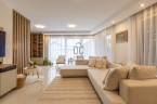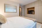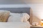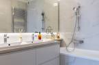 A fürdőszobák márványhatású burkolatai és lágy fényei az esti rituáléknak ad letisztult, kellemes, tiszta teret.