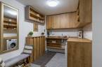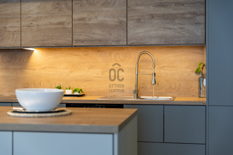 A modern, beépített konyha a sötét és világos fa árnyalataival játszik, az étkezősziget körül pedig mindig történik valami: a reggeli készülődés izgalma, a délutáni beszélgetés biztonsága, közös vacsorák hangulata ad értelmet a funkcionalitásnak.