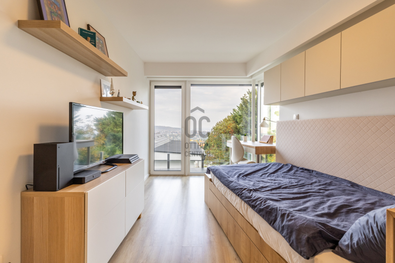 A felső szint csodás panorámával és erkélykapcsolattal kényezteti a család minden tagját, itt három külön bejáratú hálószoba és két fürdőszoba kapott helyet.