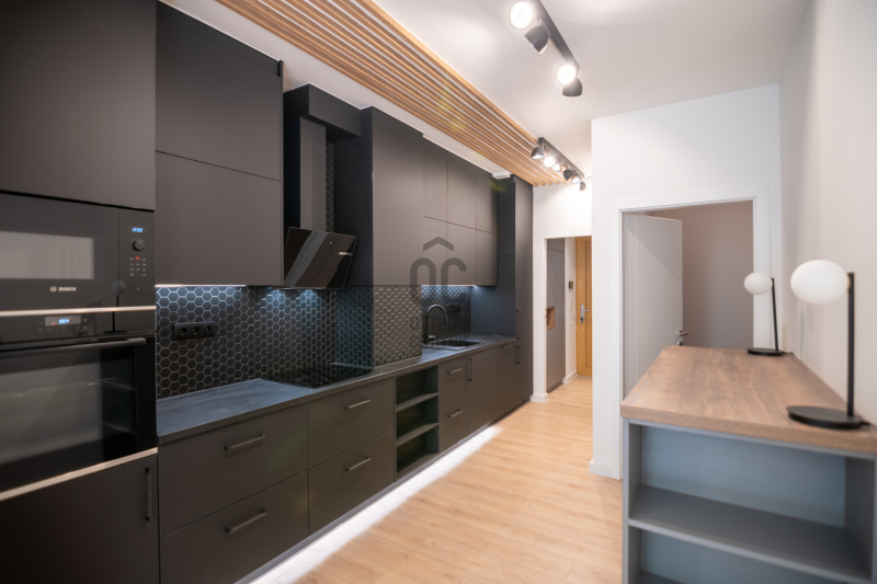 Világos nappali a lakás központi tere, amelyhez egy beépített, prémium minőségű gépesített konyha kapcsolódik, így a mindennapi élet és a vendégek fogadása is kényelmesen megoldható.