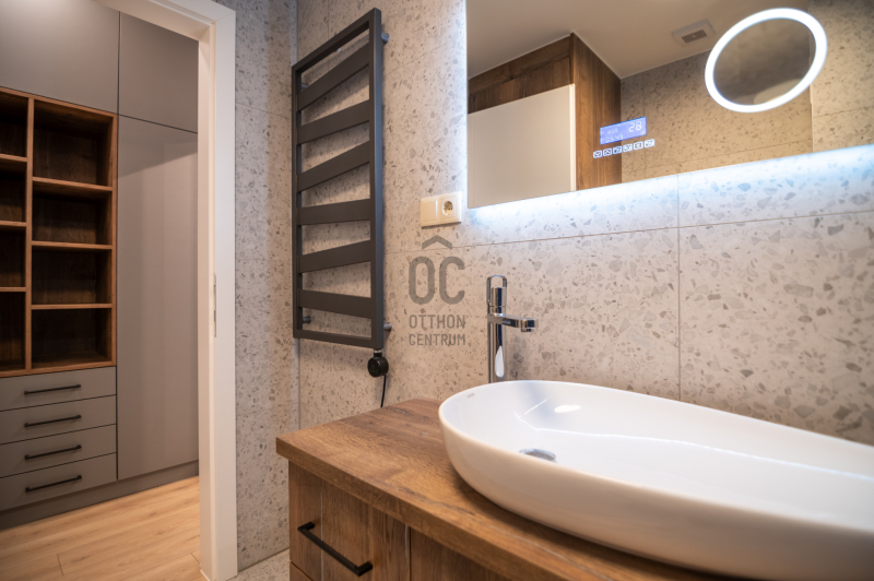 A lakás kialakítása letisztult, a felhasznált anyagok és a műszaki megoldások a kényelmes, hosszú távon is jól fenntartható használatot szolgálják.